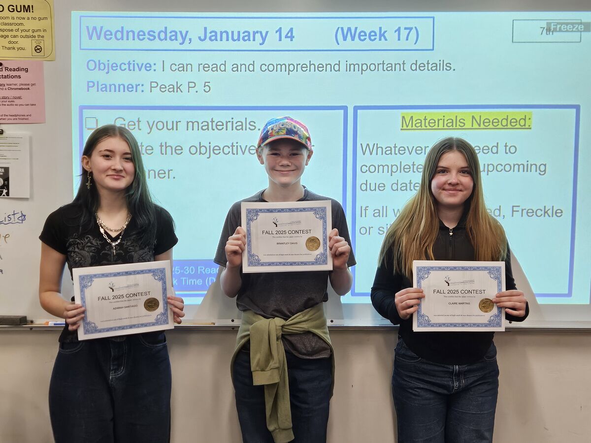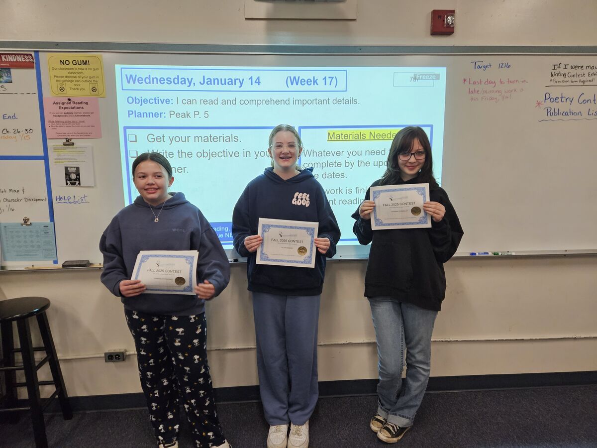 FRMS is very proud to announce that a group of our 7th and 8th grade students have had their poetry selected, through a national writing contest, for publication. Creative Communications has been hosting a national writing competition for over 20 years. This year FRMS had 12 students selected for publication in their poetry anthology after entering their competition! Not only will their poems be published in a hardbound anthology of poetry, all twelve students, and their poems, move on to the final level of the contest, where they have the chance to be selected as one of the top 10 poems submitted at their grade level nationwide. We want to congratulate all of the students and thank their teachers, Mrs. Hohnstein and Mrs. Lloyd, for giving them this opportunity to share their creativity and their talents with the nation and the world. This is a huge accomplishment for these students and we are excited to celebrate their moment in the spotlight !